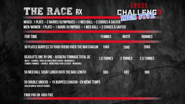 - 30 burpees par athlète en alternance le passage de relais se faisant avec une plate qu’il faut se passer au dessus de(s) la barre.