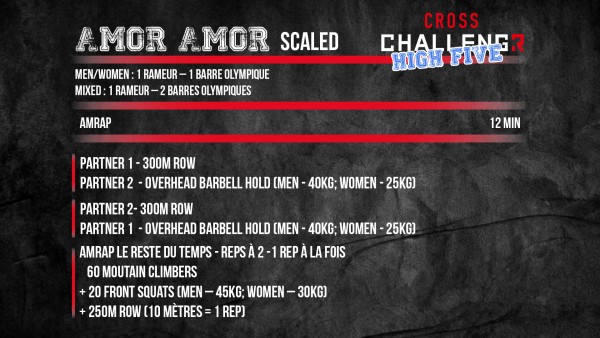 Row – Rameur : Assis sur le rameur, tirez jusqu’à ce que le compteur affiche la distance demandée. La distance au rameur sera évaluée à la fin. Si le partenaire lâche la barre ou n’est plus bras tendus, vous devez arrêter de ramer. Le réglage de la force du rameur est libre. Lors de l’AMRAP vous pouvez vous relayez.