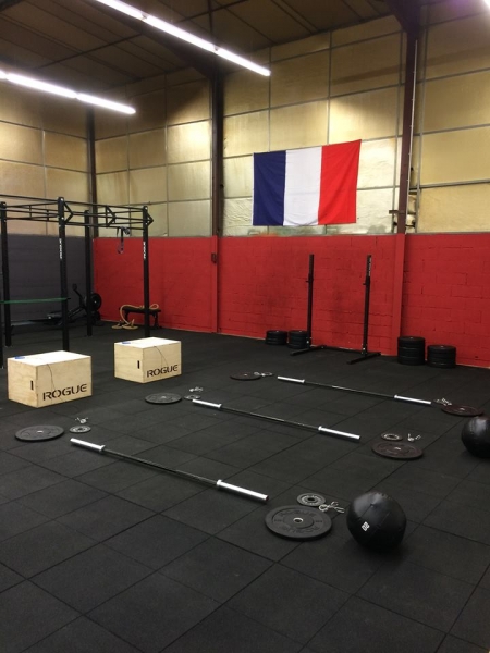Un local de 300m2 avec 200m2 de praticable. Un sol qui nous permet de dropper les barres mais uniquement en cas d’échec ou de mise en sécurité. Tout l’équipement vient de ROGUE, Rig, plyo box, 800kg de Bumpers, Ohio bar (20, 15 et 10kgs), squat stand, élastiques de toutes tailles, wall ball, rings, ab mat… Bref tout le matériel nécessaire pour démarrer un bon apprentissage des fondamentaux.