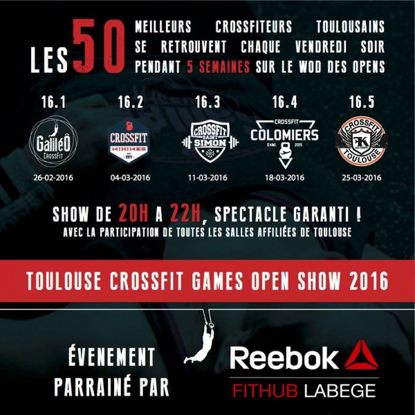 Sans oublier le début des Opens avec le 16.1 qui a été annoncé hier soir. A Toulouse du grand spectable avec les 50 meilleurs crossfiteurs qui se retrouveront le vendredi soir pour le passer ensemble !
