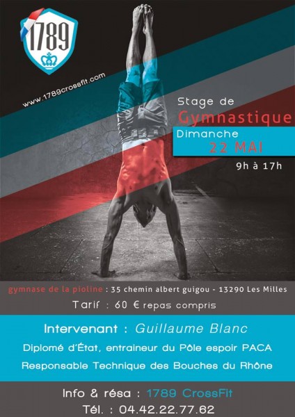Dimanche 22 mai nous organisons un stage de gymnastique, gymnase de la Pioline à Aix en Provence. Ce stage s’adresse à tous, débutants comme confirmés. Vous travaillerez tous les mouvements de gym associés à notre discipline. N’hésitez pas à nous contacter si vous êtes intéressés ! infos sur le flyer. – à 1789 Crossfit.