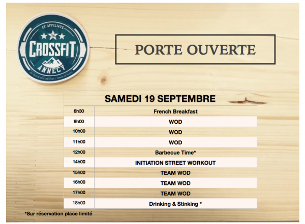 Dimanche: On commence par un Wod découverte kettlebell à 9h, suivi d’un wod initiation à 10h et on finit la matinée par un Wod Bring a Friend ou il s’agit pour nos adhérents de faire découvrir le CrossFit à un ami lors d’un wod en équipe ^^. Reprise à 14h avec un autre Wod Bring a Friend suivi de 3 créneaux découvertes ( 15h/16/17h ).